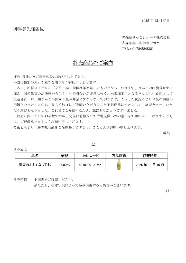 2025年12月10日をもちまして、シャイニー青森のおもてなし王林1,000ml瓶を終売することとなりました。