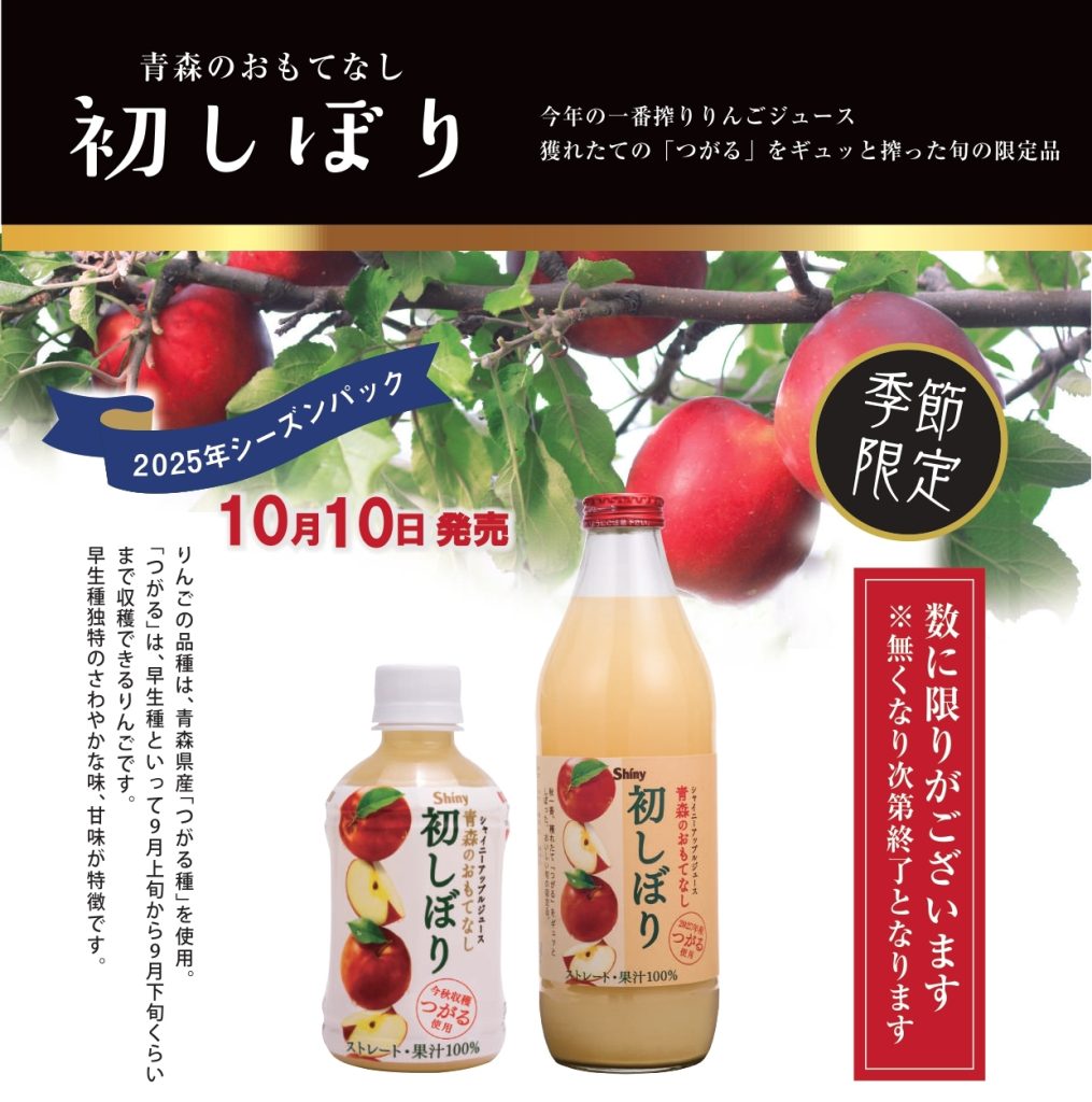 2025年、この秋収穫したつがるりんごだけで搾った「初しぼりりんごジュース」が10月10日発売になります。1000ml瓶、280mlペットボトルの2種類展開で、用途に応じてご選択頂けます。今年のりんごの風味を味わってみませんか。